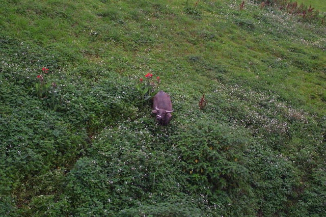 雖然走錯路卻意外發現一條牛竟然藏身在河堤草叢中, 和我大眼瞪小眼, 可能牠也感覺到我是屬牛的...